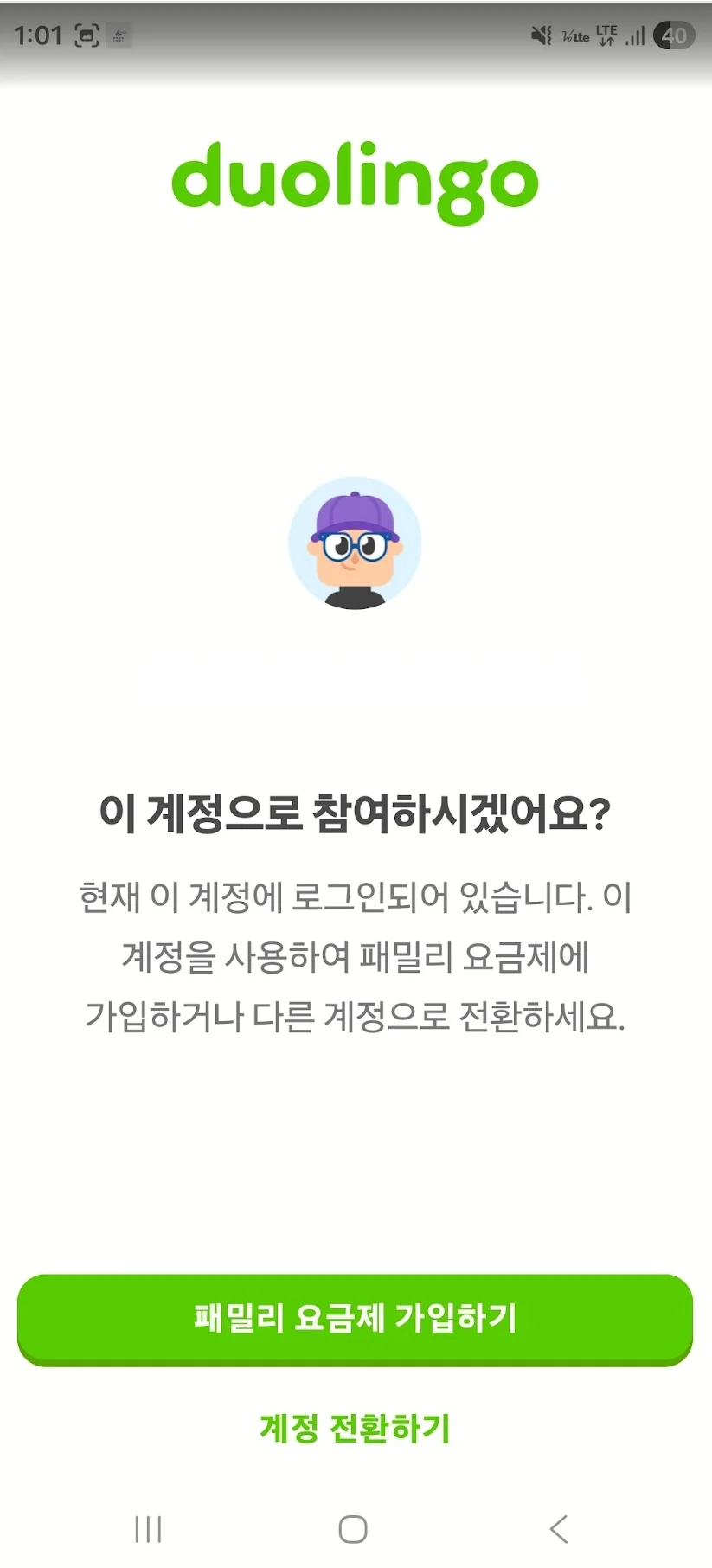 - 이어서 "슈퍼 듀오링고 패밀리 요금제 초대를 받으셨습니다"라는 안내가 나오고, 무슨 ID가 초대했다는 메시지가 표시된다.