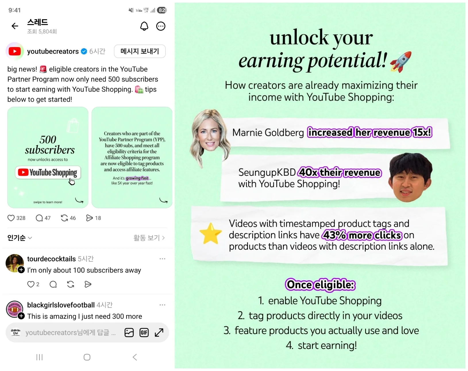 - 블로그: https://blog.youtube/creator-and-artist-stories/youtube-shopping-expansion-500-subscribers/